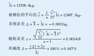 數據統計誤差通常分隨機誤差和系統誤差。隨機誤差是在實際測量條件下多次測量同一量值時,誤差的絕對值和符號以不同方式變化著的誤差。它反映了被測檢驗裝置的精度,隨機誤差越小,說明其精度越高。系統誤差是在偏離規定的測量條件下多次測量同一量值時,誤差的絕對值和符號保持恒定的誤差。系統誤差反映了被測檢驗裝置的正確度,系統誤差越小,說明其正確度越高。評價檢驗裝置的精度既不能單獨看其隨機誤差,也不能單獨考查其系統誤差,而是要對其進行綜合分析和計算,從而確定被測檢驗裝置的綜合指標,即準確度(此時不討論誤差分配問題)。2003年8月23日在現場測試循環鏈碼稱量數據10次:12496  12497  12498  12495  12499  12496  12497 12499 12497 12499,通過對循環鏈碼總重量計算值為